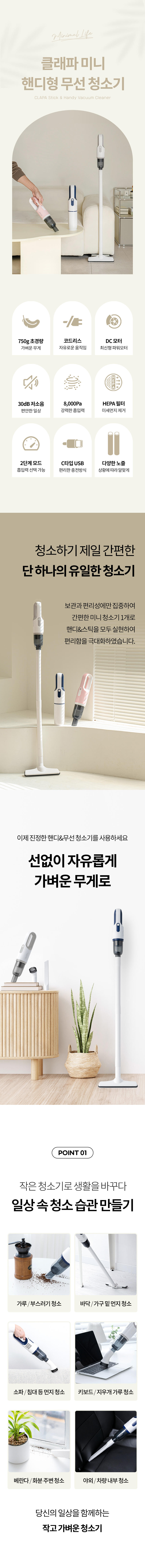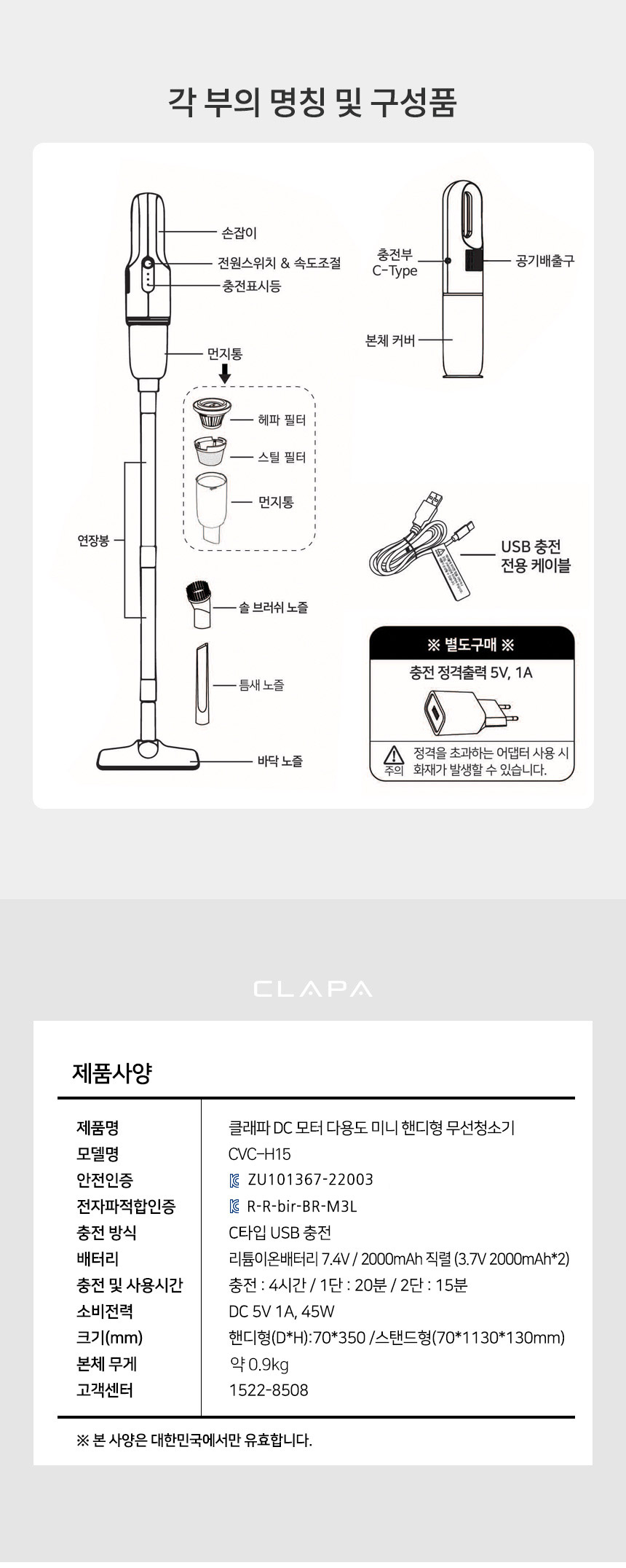 [국내발송] 클래파 차량용 휴대용 미니 진공 무선청소기 CVC-H15 초강력 핸디형